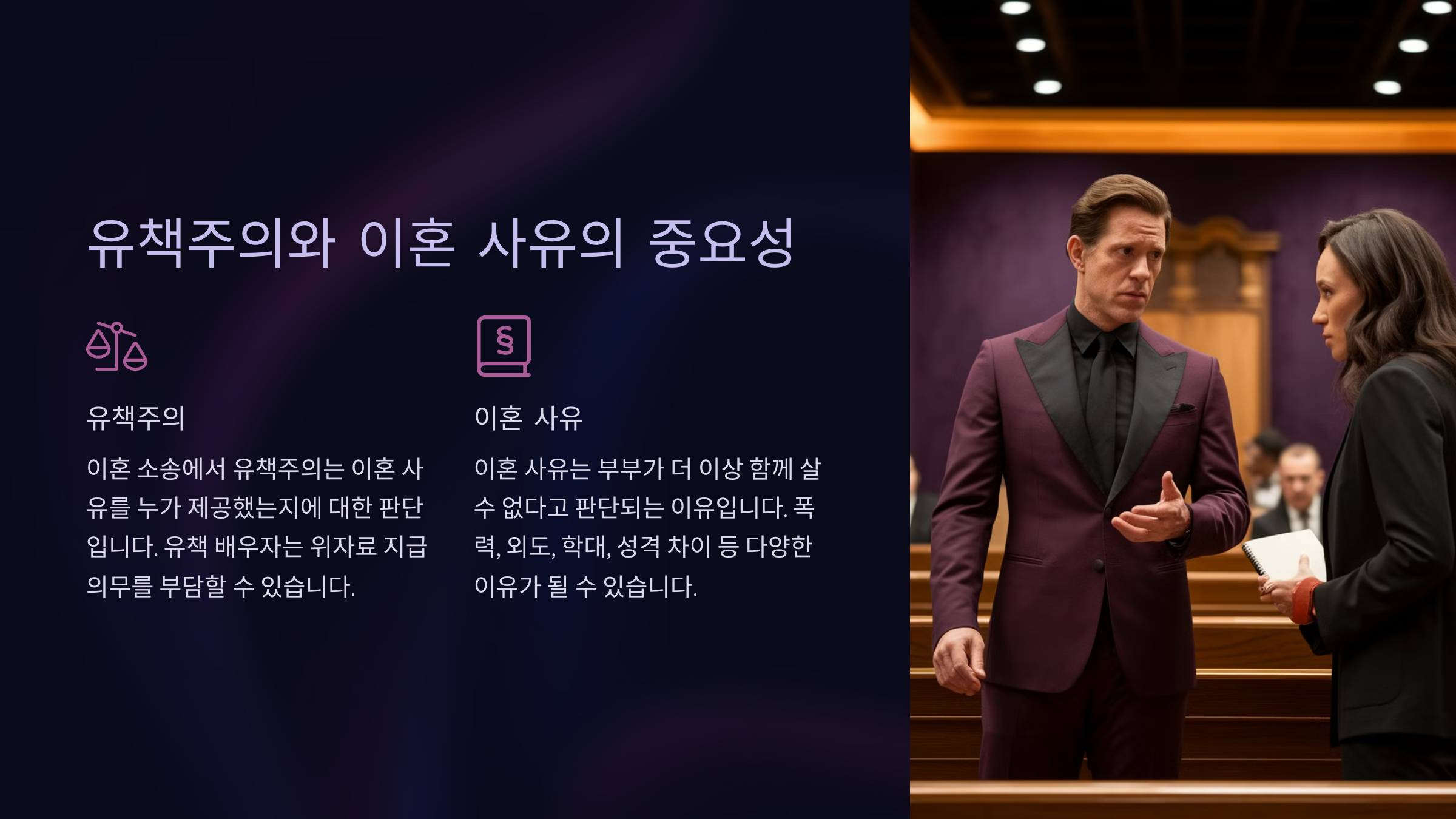 한국의 이혼소송은 유책주의를 기반으로 진행되기 때문에, 한쪽 배우자의 잘못이 명백해야 재판상 이혼이 성립돼요. 대표적인 이혼 사유로는 배우자의 외도, 가정 폭력, 경제적 무책임, 정당한 이유 없는 별거 등이 있어요.