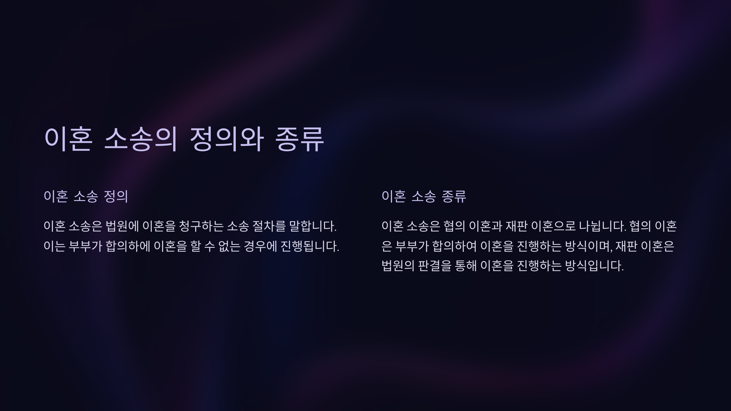 이혼소송은 배우자와의 결혼 생활을 법적으로 종료하기 위해 법원에 제기하는 소송이에요. 이혼은 크게 합의 이혼과 재판상 이혼으로 나뉘어요. 합의 이혼은 양측이 이혼에 동의하고 세부 조건을 협의하는 방식이에요. 반면, 재판상 이혼은 한쪽 배우자가 동의하지 않거나 합의가 어려울 때 법원의 판결을 통해 이루어져요.