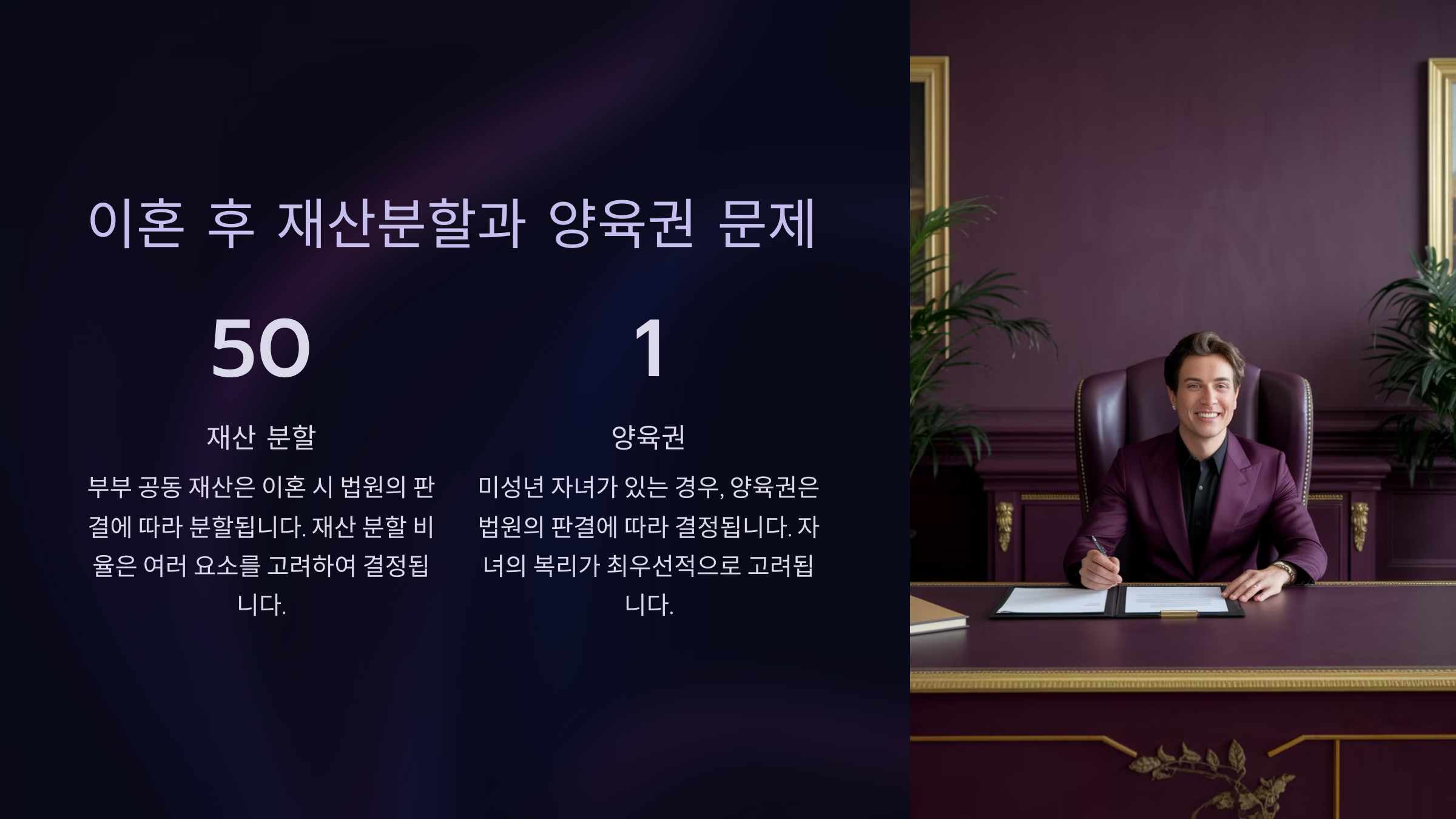 이혼소송은 결혼 생활의 종료뿐 아니라, 자녀 양육권, 면접 교섭권, 재산분할, 위자료 등 다양한 법적 문제를 다뤄야 하기에 신중한 접근이 필요하답니다.