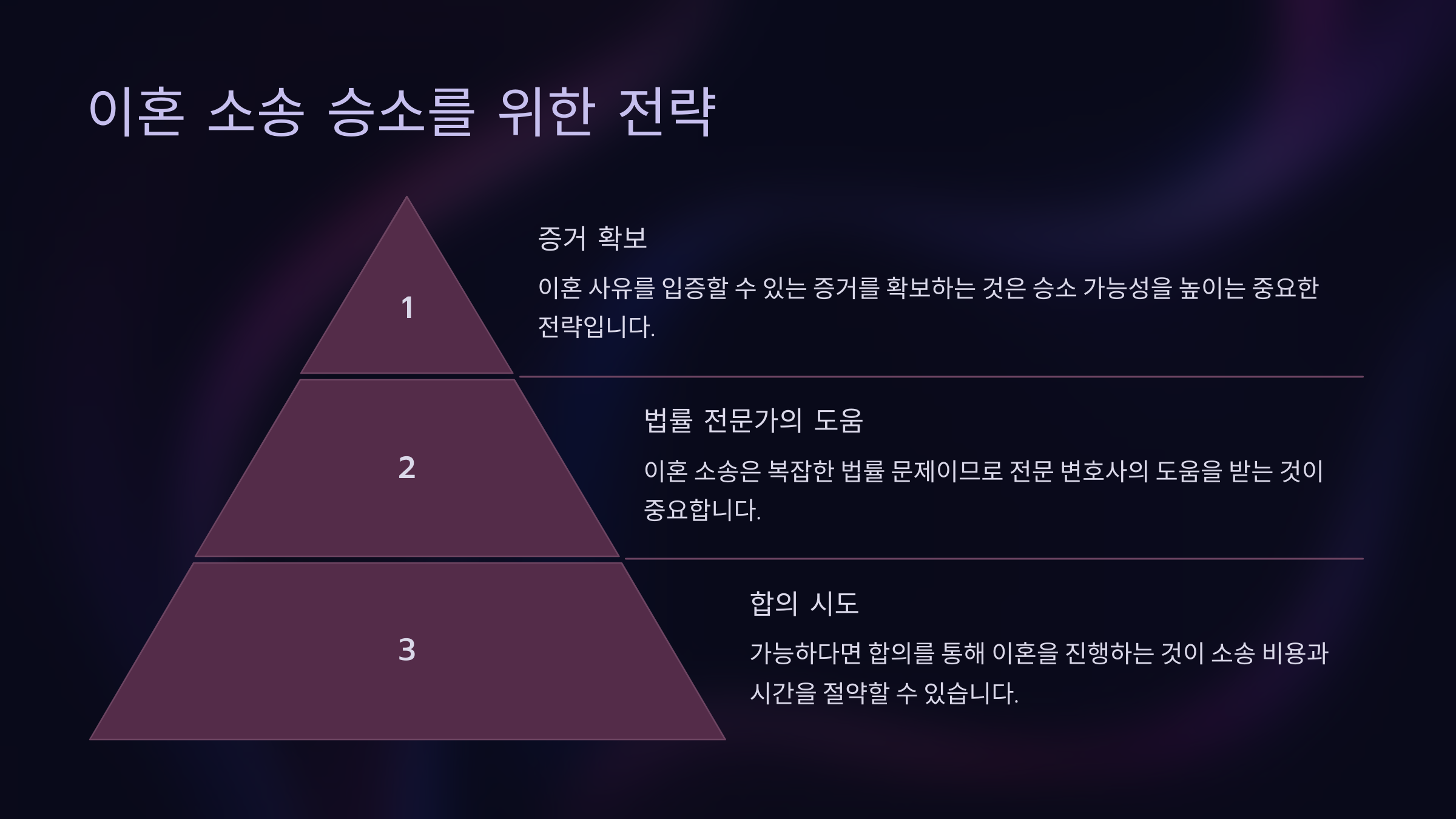 이혼소송에서 승소하기 위해서는 철저한 준비와 전략이 필요해요. 첫 번째로, 상대 배우자의 잘못을 명확히 증명할 수 있는 증거를 준비해야 해요. 예를 들어, 배우자의 외도나 가정 폭력을 입증할 수 있는 사진, 문자 메시지, 증언 등을 철저히 수집하세요.