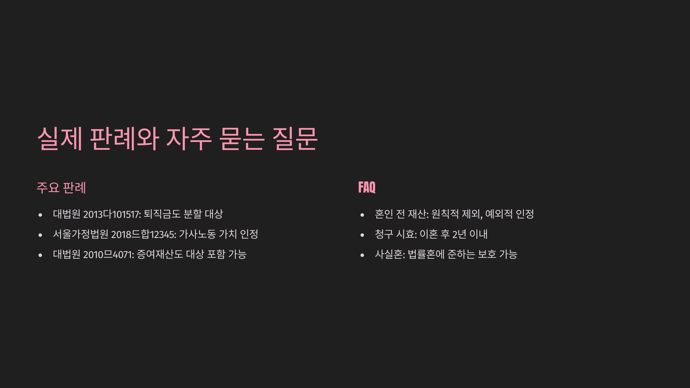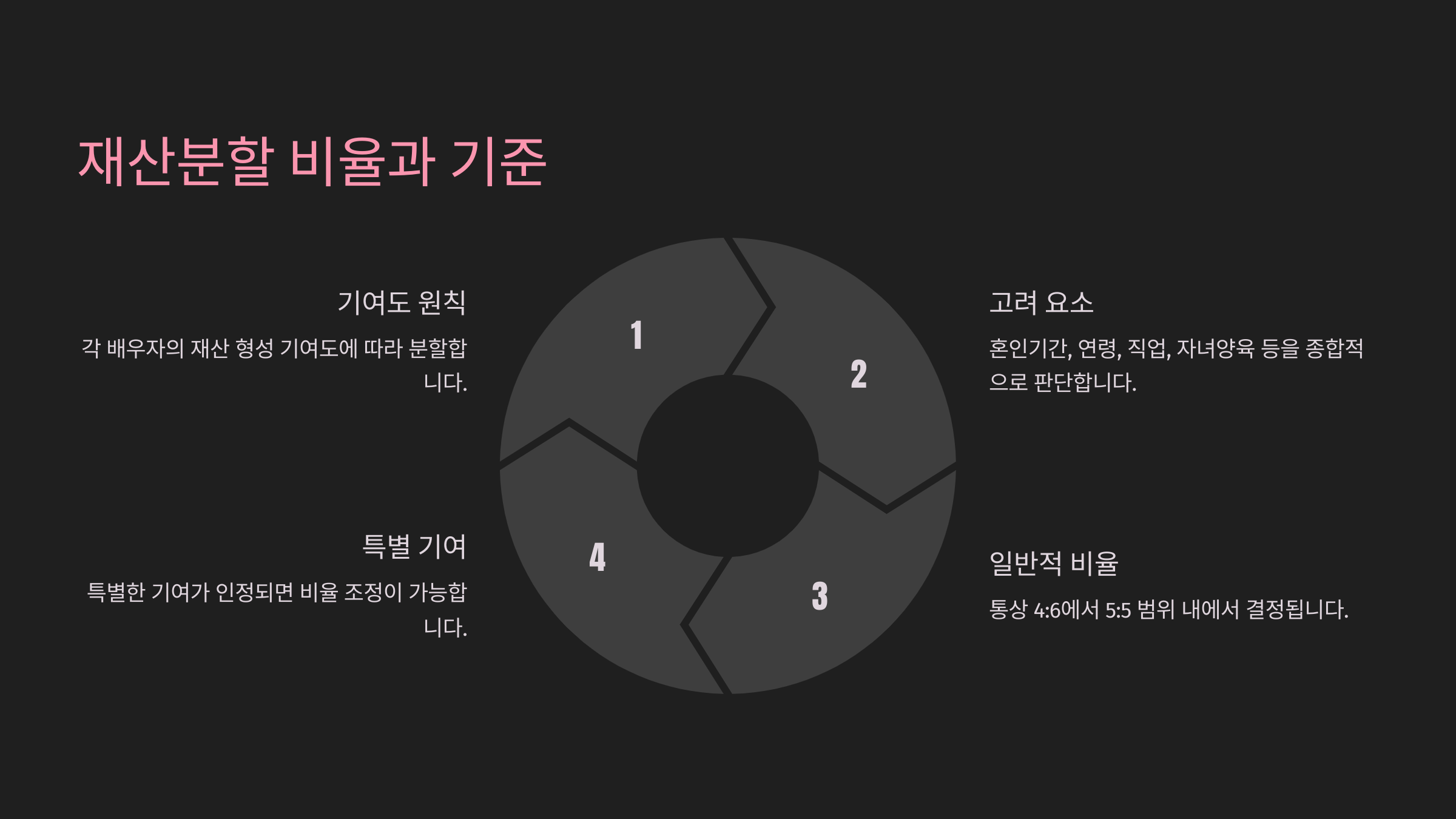 | 맞벌이 부부 (혼인 10년) | 5:5 | 경제적 기여도가 비슷하여 동일한 비율로 분배 |