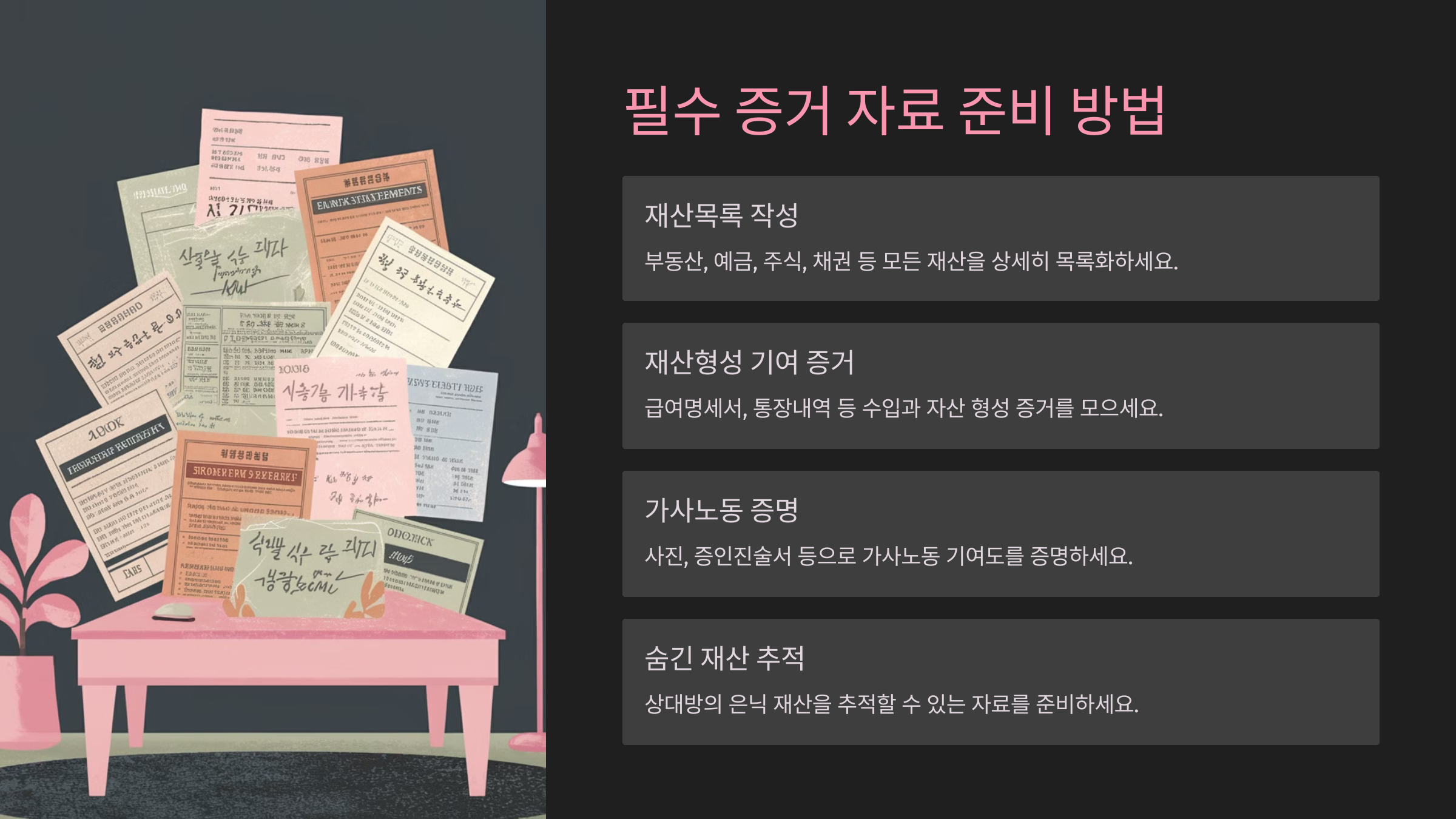 | 📝 기여도 증명 자료 준비 | 재산 형성 과정에서의 기여 내역 문서화 |