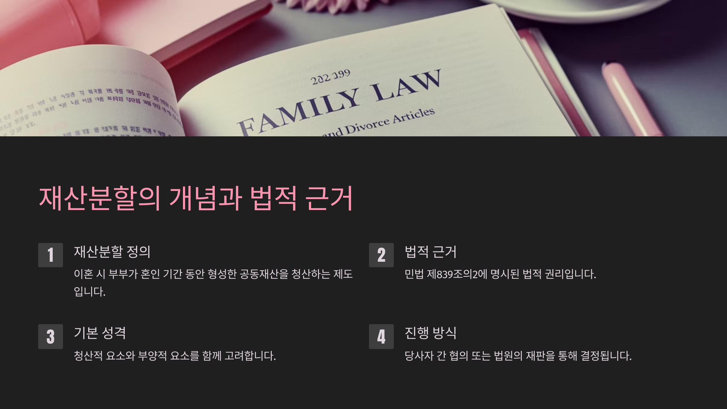 재산분할은 이혼 시 부부가 공동으로 형성한 재산을 각자의 기여도에 따라 나누는 절차예요. 대한민국 민법 제839조의 2에 의해 규정되어 있으며, 이 법 조항에 따라 법원이 재산분할 비율을 결정하게 돼요.