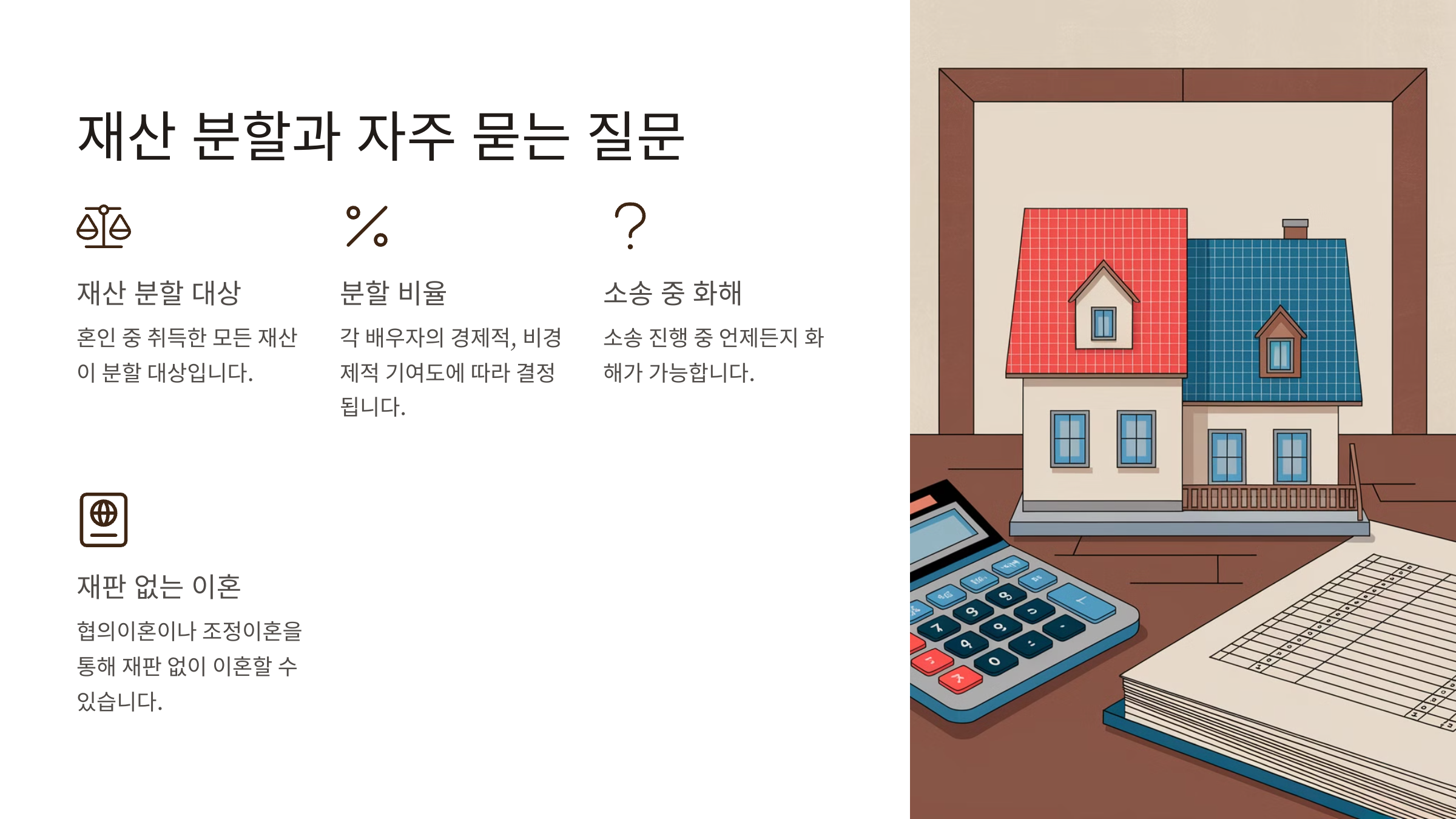 이혼 시 재산 분할은 중요한 문제예요. 혼인 중 형성된 재산은 부부 공동의 기여로 간주되므로 공정하게 나누는 것이 원칙이에요.