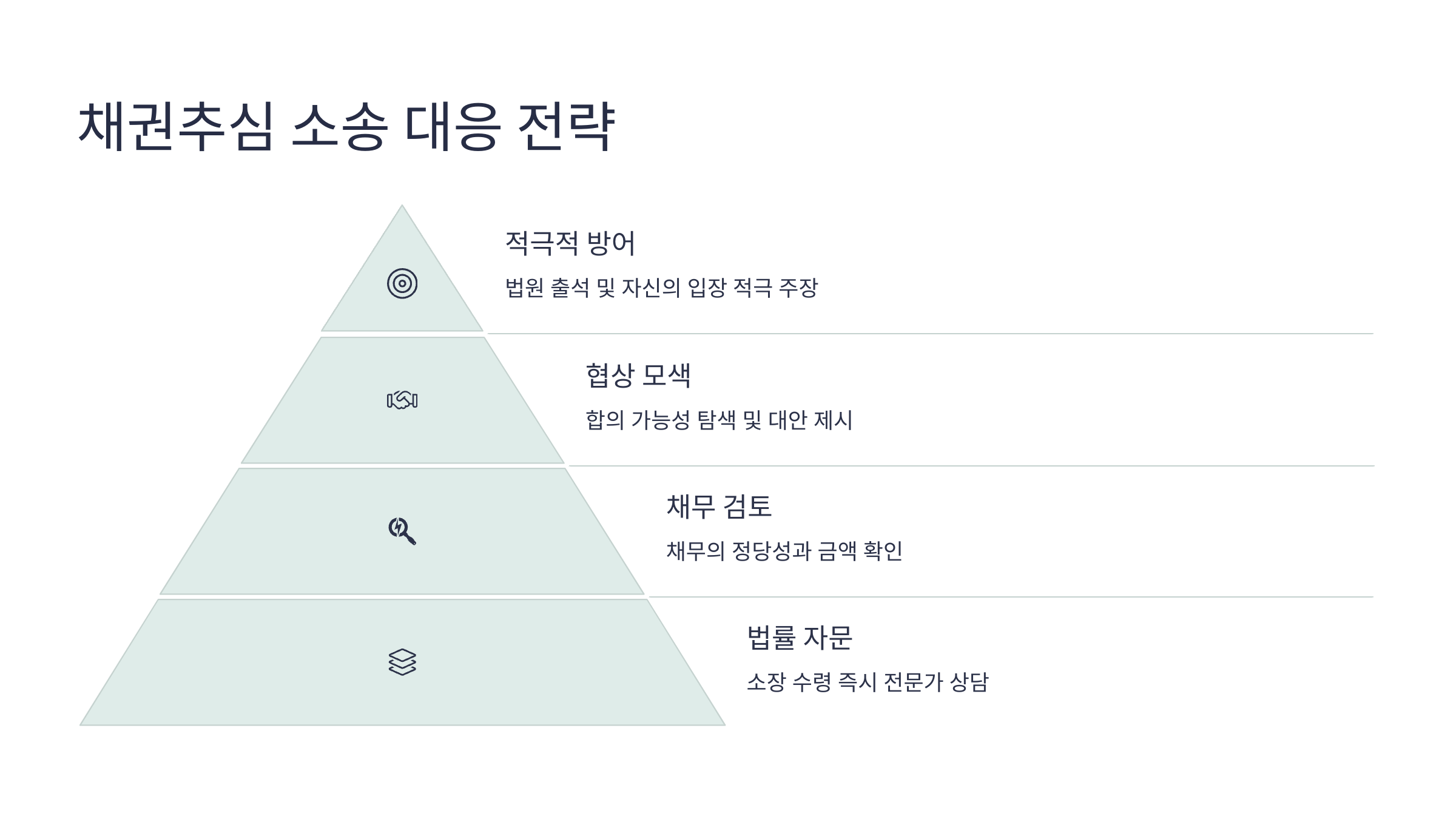 | 4. 판결 및 강제집행 | 채무자가 패소하면 재산 압류 가능 | 재산 보호 및 합의 시도 |
