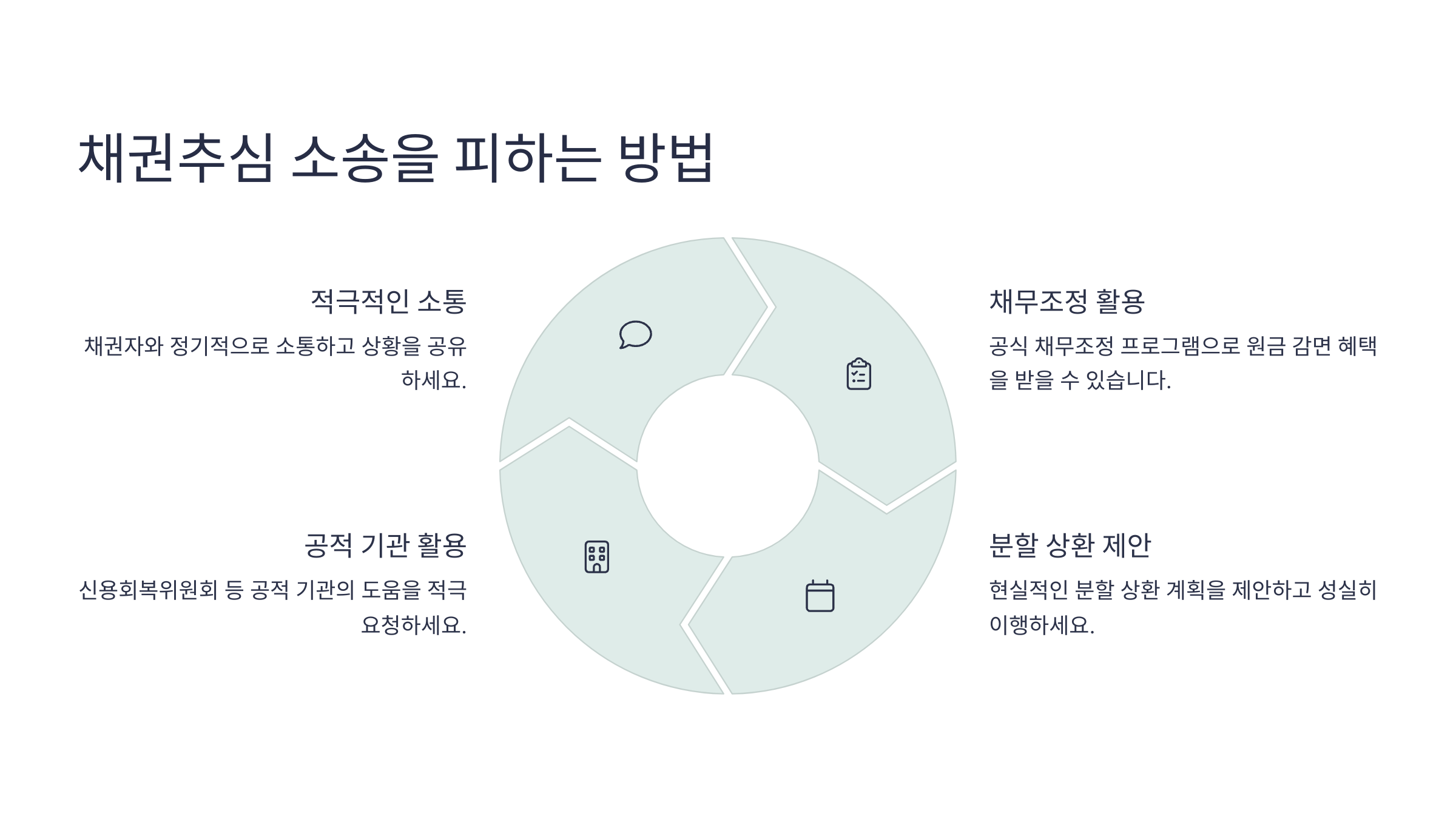 특히 빚을 갚기 어려운 경우, 채권자와 협상하는 것이 가장 효과적인 방법이에요. 분할 상환을 요청하거나 일정 기간 유예를 받으면 소송까지 가는 일을 막을 수 있어요.