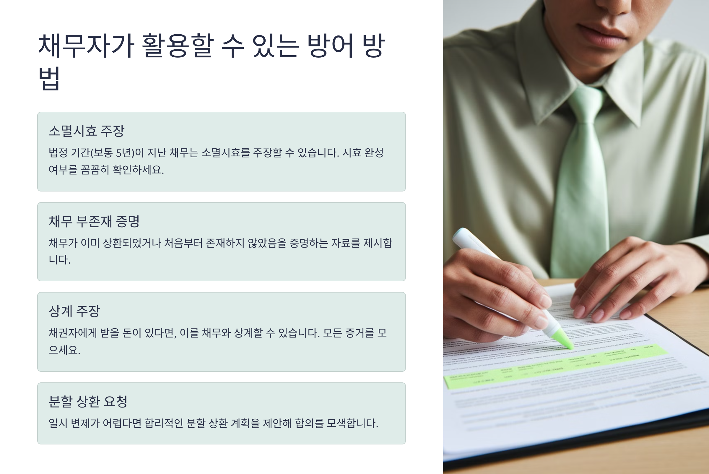 | 4. 소멸시효 주장 | 채권의 소멸시효(일반적으로 10년)가 지났다면 변제 의무 없음 | 최근 상환 기록이 있는지 확인 |