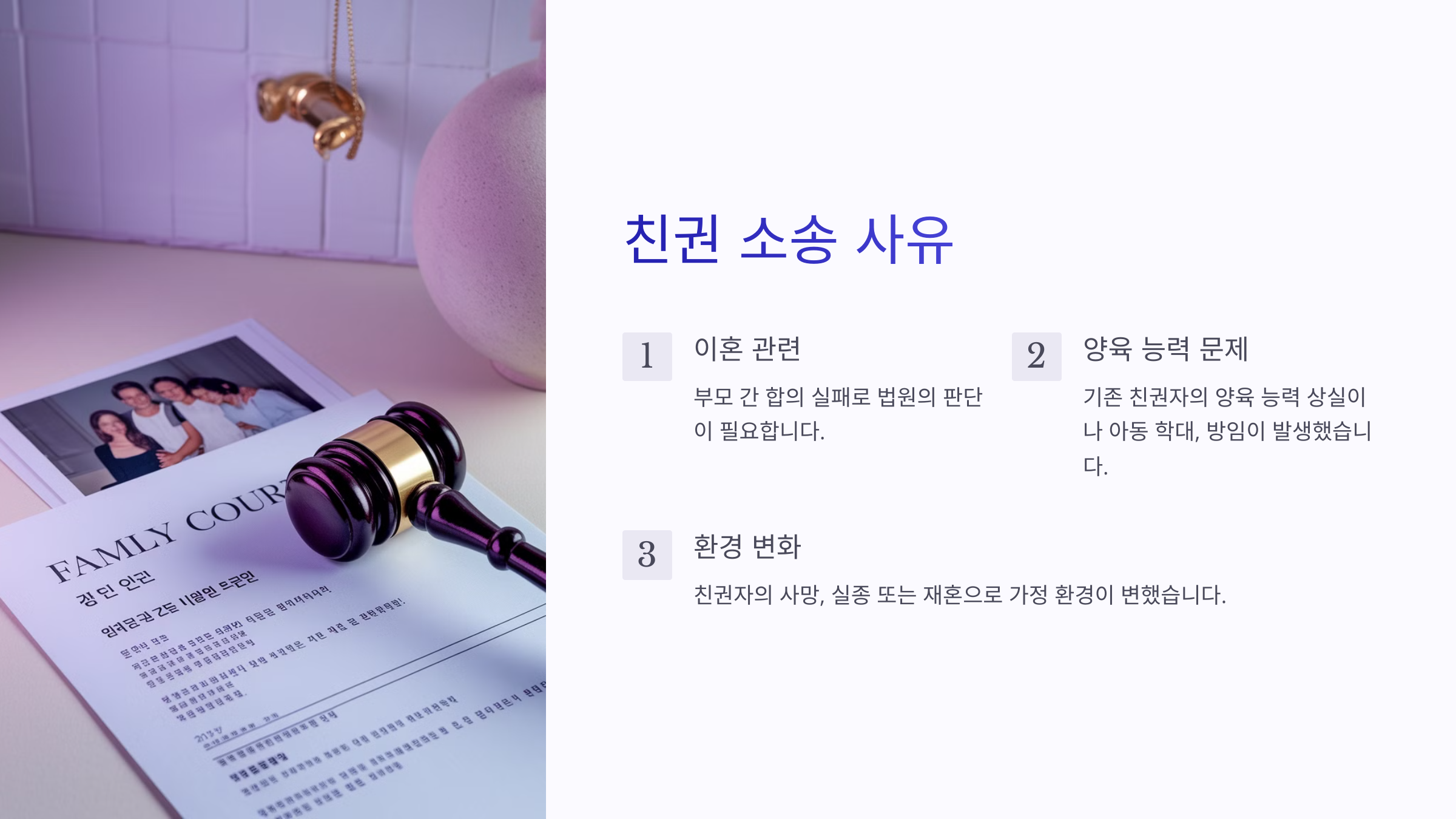 👨⚖️ 친권 소송은 부모가 자녀에 대한 법적 권리와 책임을 다투는 중요한 절차예요. 이혼, 별거, 부모의 부적절한 양육 등의 사유로 인해 친권 변경이 필요할 수 있죠.