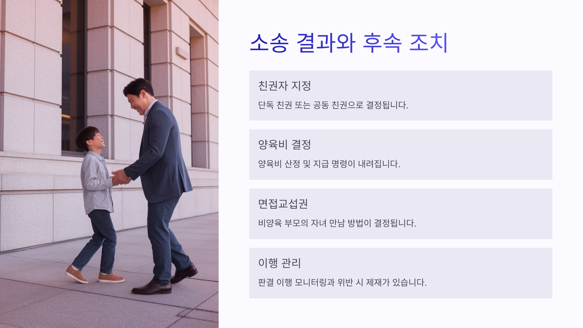 법원은 모든 증거와 진술을 종합해 최종 결정을 내려요. 만약 법원이 친권 변경을 인정하면, 새로운 친권자가 법적으로 등록되며 기존 친권자의 권리는 종료될 수 있어요.